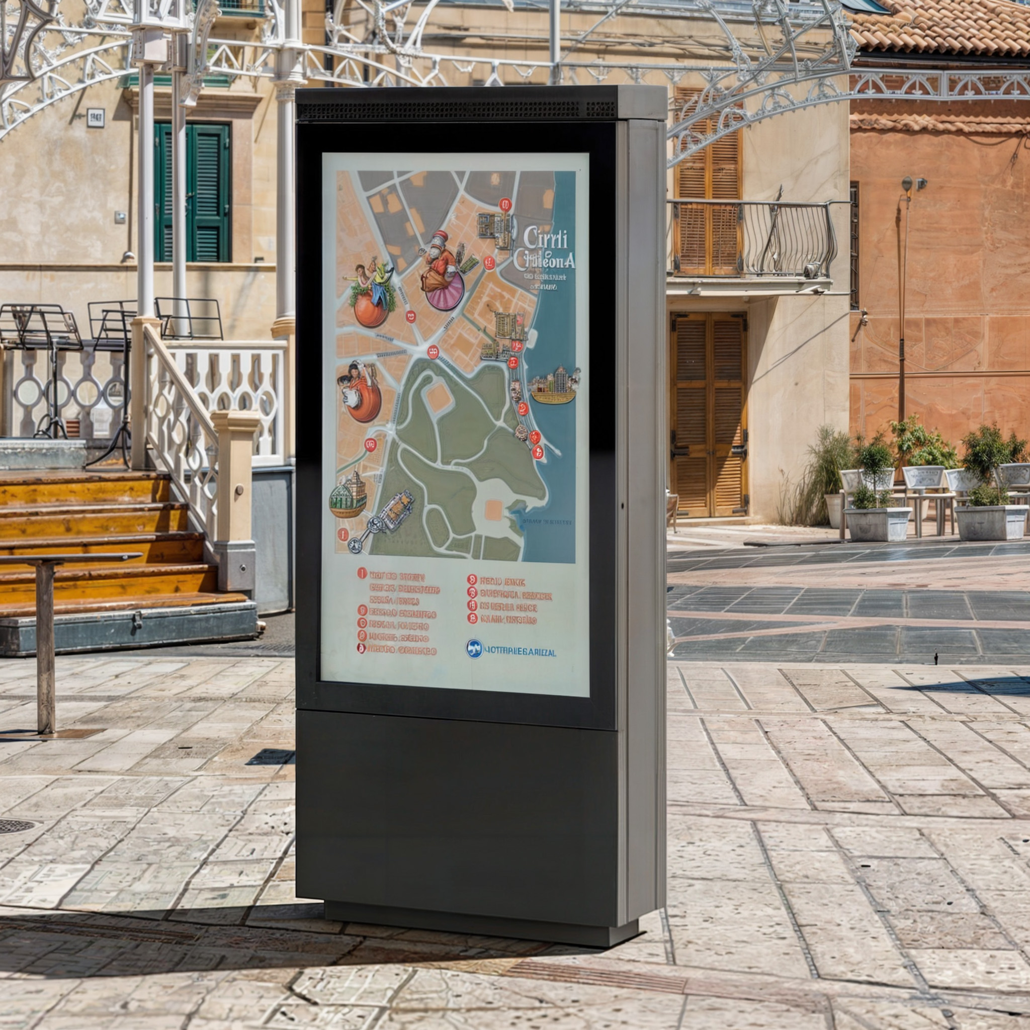 high-resolution touchscreen display of 65, 75, or 86 inches, ATENA D delivers an extraordinary visual experience in any weather condition. With its IP65 protection and 8mm laminated glass, this double-sided totem offers unmatched security and robustness. Intelligent energy management, through an advanced control board, optimizes electrical consumption, minimizing environmental impact. Additionally, remote management and online monitoring capabilities ensure total control and easy maintenance.ATENA is the perfect solution for a wide range of environments, including shopping centers, hospitality, museums, and municipalities. Thanks to its versatility and superior performance, it can meet the most demanding digital communication needs. Don’t miss the opportunity to elevate your outdoor communication to the next level with the ATENA Totem.